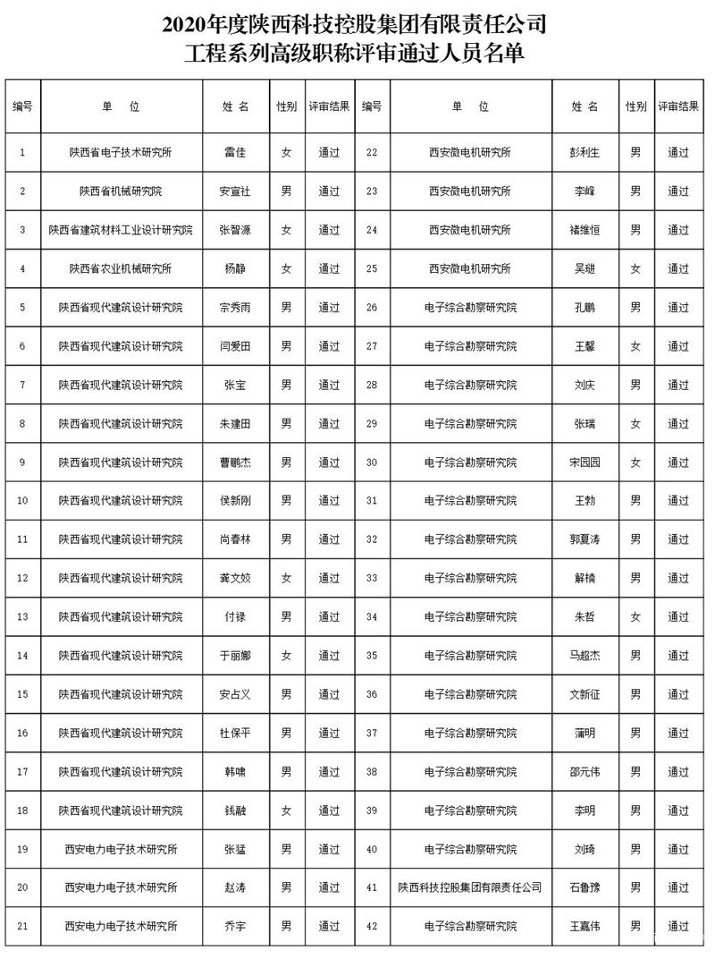 經(jīng)2020年度陜西科技控股集團有限責任公司工程系列高級職稱評委會評審,共42名同志通過評審,現(xiàn)予以公示。