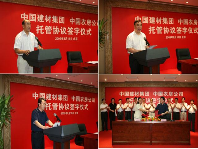 8月18日,中國(guó)建材集團(tuán)與中國(guó)農(nóng)房公司在北京簽署托管協(xié)議,中國(guó)建材集團(tuán)按照國(guó)資委要求正式托管中國(guó)農(nóng)房公司。國(guó)資委黨委委員李壽生出席協(xié)議簽署儀式并作重要講話。中國(guó)建材集團(tuán)董事長(zhǎng)、黨委書記宋志平,中國(guó)農(nóng)房公司總經(jīng)理張子山分別致辭。中國(guó)建材集團(tuán)總經(jīng)理、黨委副書記姚燕和中國(guó)農(nóng)房公司總經(jīng)理張子山代表雙方簽字。儀式由國(guó)資委機(jī)關(guān)服務(wù)管理局局長(zhǎng)劉茂勛主持。